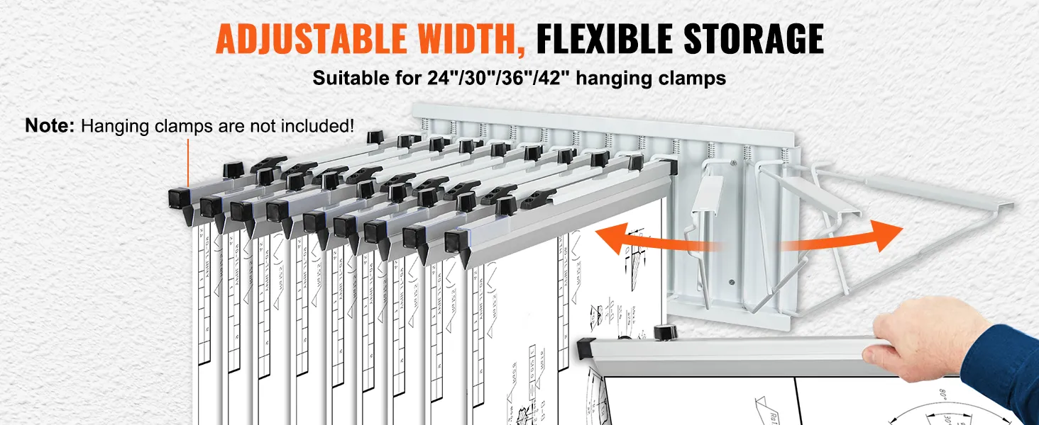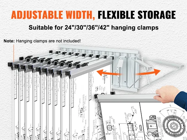 Ontwerp met verstelbare breedte: onze blauwdrukstandaard is voorzien van draaibare beugels die naar links en rechts kunnen worden gedraaid voor eenvoudig gebruik. Er kunnen maximaal 12 ophangclips in worden geplaatst (niet meegeleverd) en is geschikt voor het ophangen van documentclips van 24, 30, 36 of 42 inch.
