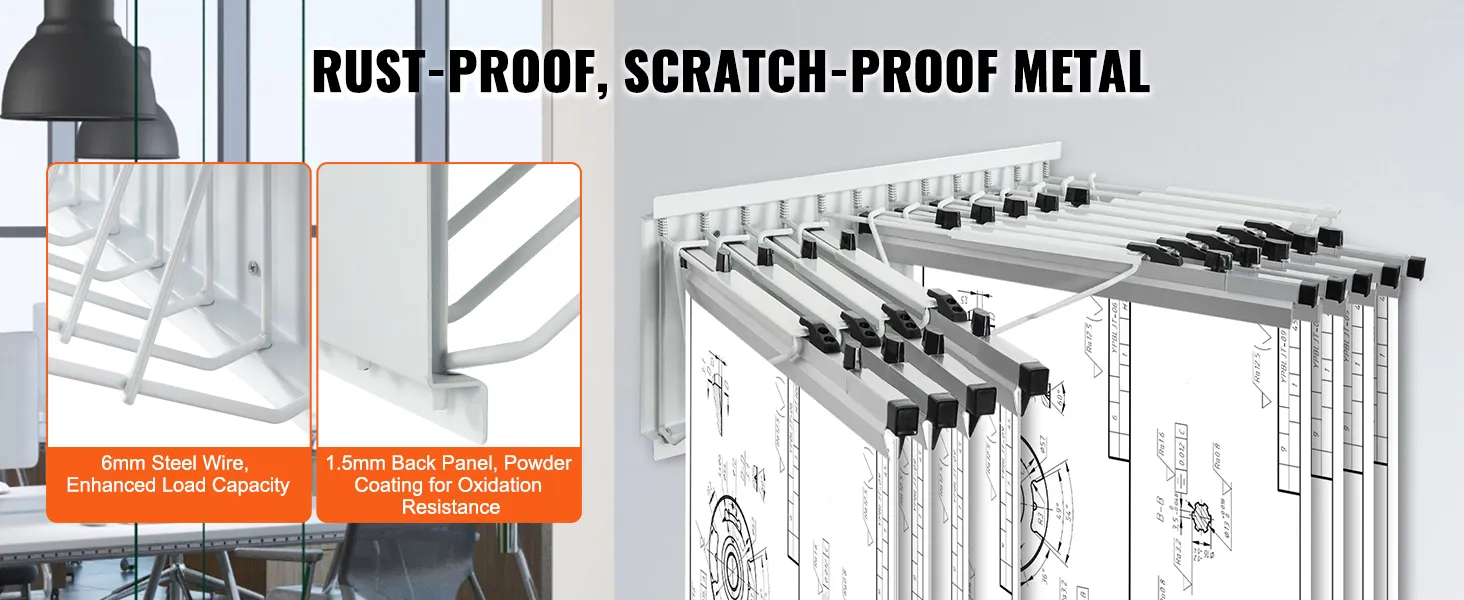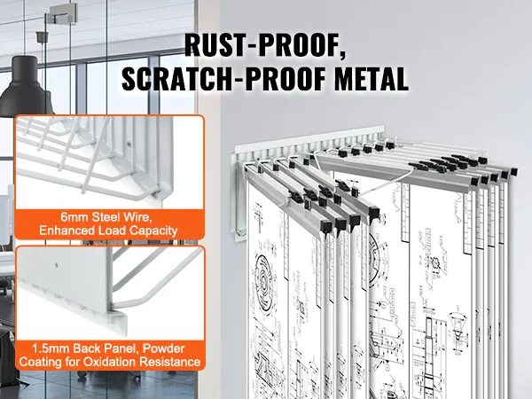 Efficiënte opslagoplossing: met 12 draaibare beugels kan deze Blueprint-wandplank maximaal 109 kg (240 lbs) of 1200 vel documenten bevatten. Het biedt voldoende georganiseerde opslagruimte voor blauwdrukken, blauwdrukken en diverse documenten, waardoor de efficiëntie wordt gemaximaliseerd en gemakkelijk toegankelijk is.