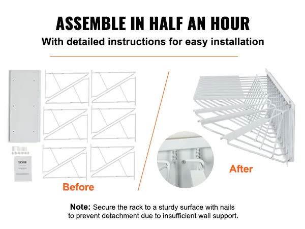 Het eenvoudige montageproces bespaart u tijd en moeite. Hoogwaardige hardware zorgt voor een veilige installatie van het rek. Dit maakt het installatieproces eenvoudig, zelfs voor mensen met basisvaardigheden als doe-het-zelver. De eenvoudige montage maakt ook snelle aanpassingen mogelijk indien nodig.