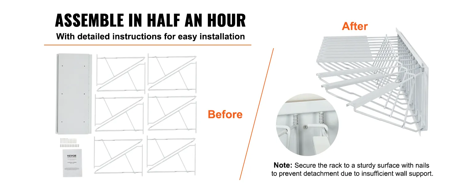Eenvoudig te monteren: wij bieden montage-instructies en alle benodigde onderdelen, zodat er geen extra gereedschap of ingewikkelde stappen nodig zijn. Je zet hem binnen een half uur in elkaar en bevestigt hem aan een muur of stabiele ondergrond.