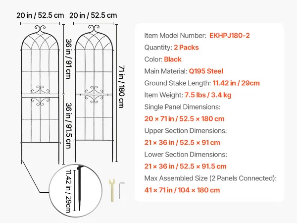 Stabiele ondersteuning: Deze set van twee metalen rozenrekken bestaat uit panelen van 180 x 52,5 cm. Dankzij de 29 cm lange grondpinnen kan het rek stevig in de grond, het gras of vochtige ondergrond worden verankerd zonder om te vallen, waardoor het optimale ondersteuning biedt aan klimplanten.