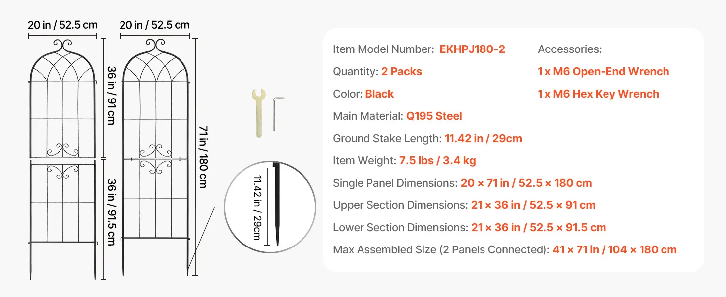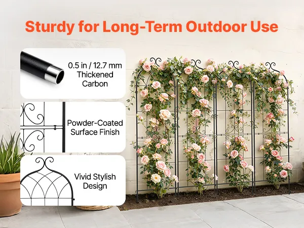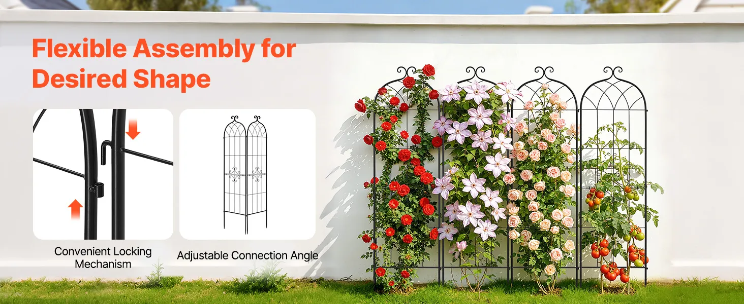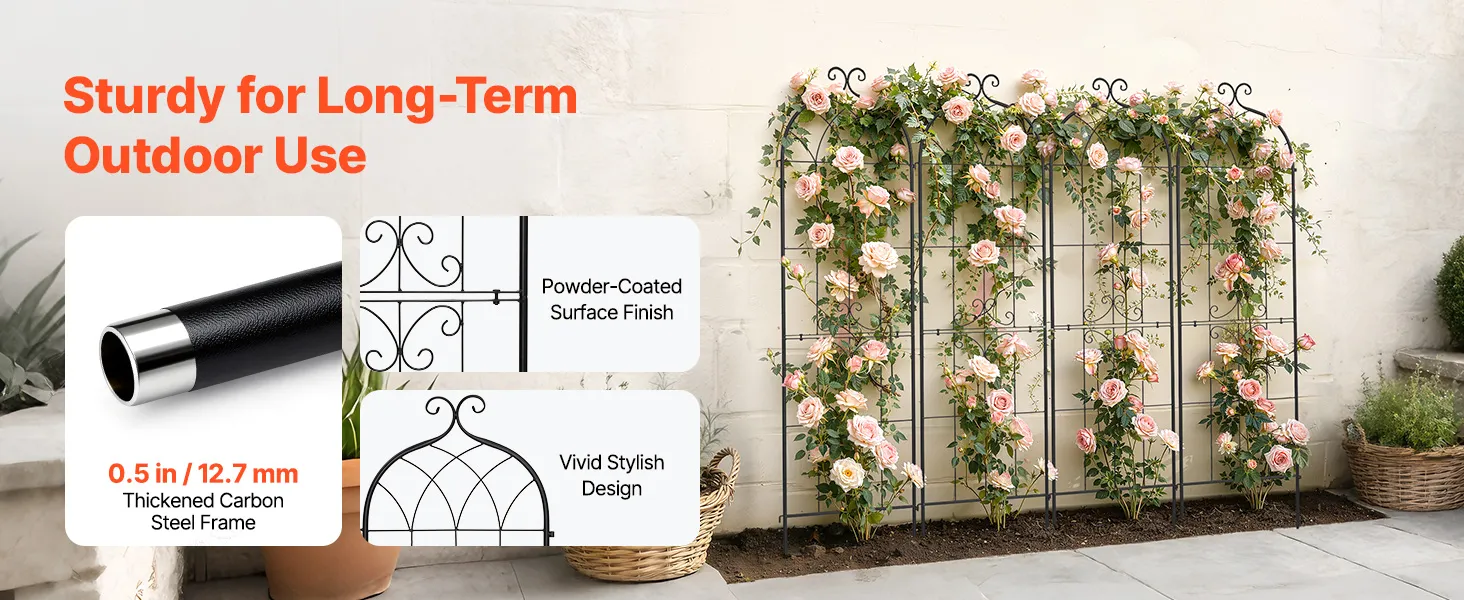 Eenvoudige montage: Geen specialistische kennis vereist – zelfs beginners kunnen deze rozenrank gemakkelijk in elkaar zetten. Verbind de boven- en onderelementen eenvoudig met de schroeven en de meegeleverde sleutel. Dankzij de geïntegreerde verbindingsstukken kunt u de elementen afzonderlijk verbinden om uw eigen tuinontwerp te creëren.