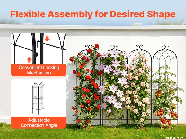 Elk klimrek voor clematis bestaat uit twee delen die snel in elkaar gezet kunnen worden met de meegeleverde sleutel en schroeven. Dankzij de geïntegreerde verbindingsstukken kunt u meerdere klimrekken aan elkaar koppelen en de hoeken flexibel aanpassen om de ideale vorm voor uw tuin te creëren.
