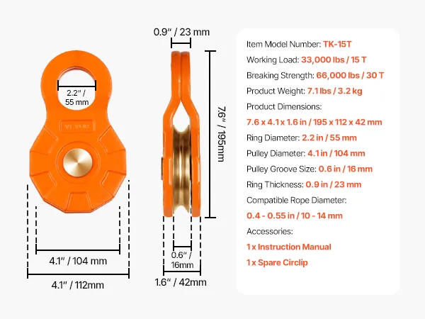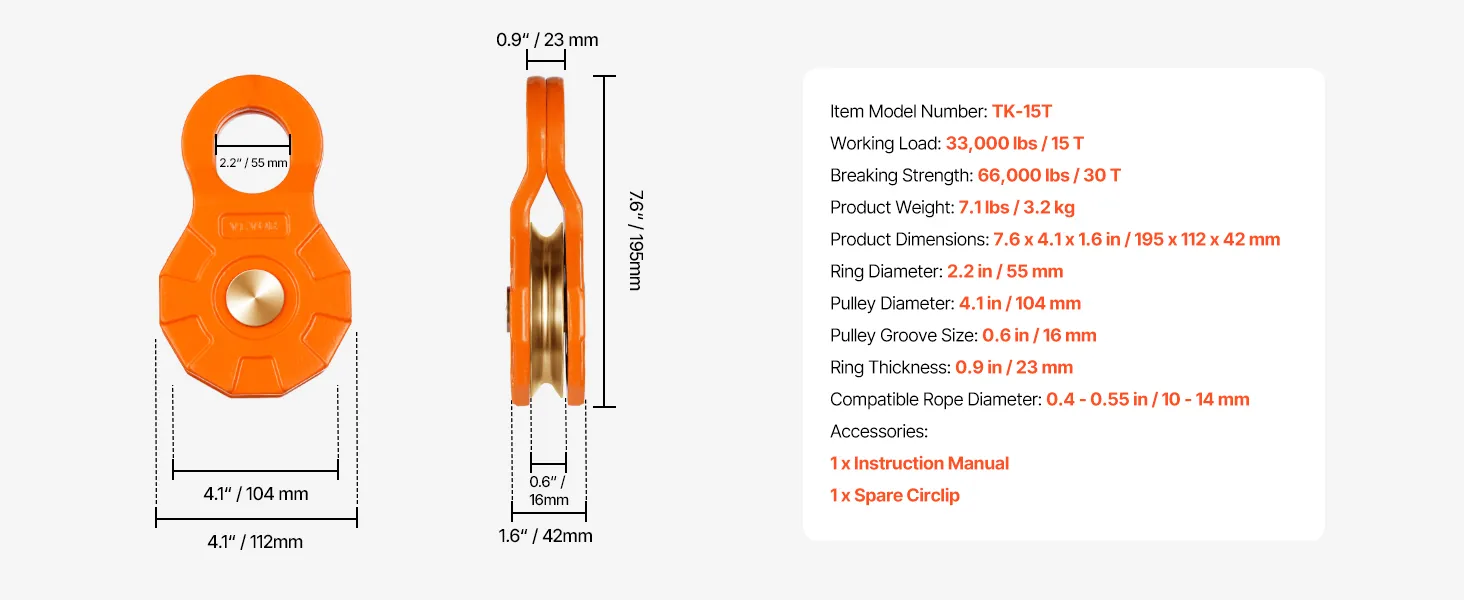 This snatch block handles up to 33,000 lbs (15T) working load and 66,000 lbs (30T) break strength. Ideal for heavy-duty tasks like vehicle recovery and tree hauling, it gets the job done with ease and efficiency.