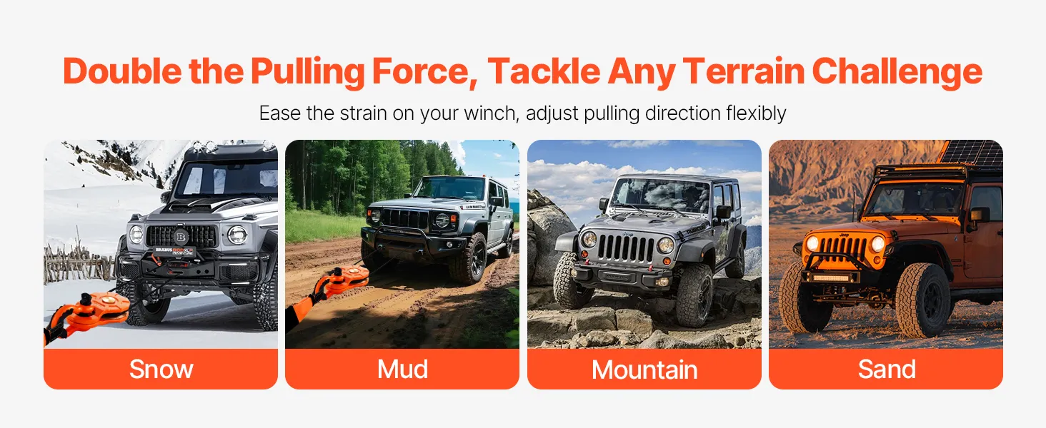 With the snatch block pulley, boost your winch’s pulling capacity! It reduces winch strain and prolongs its lifespan. Whether you're navigating mud, sand, or snow, this block helps your vehicle power through different terrains effortlessly.