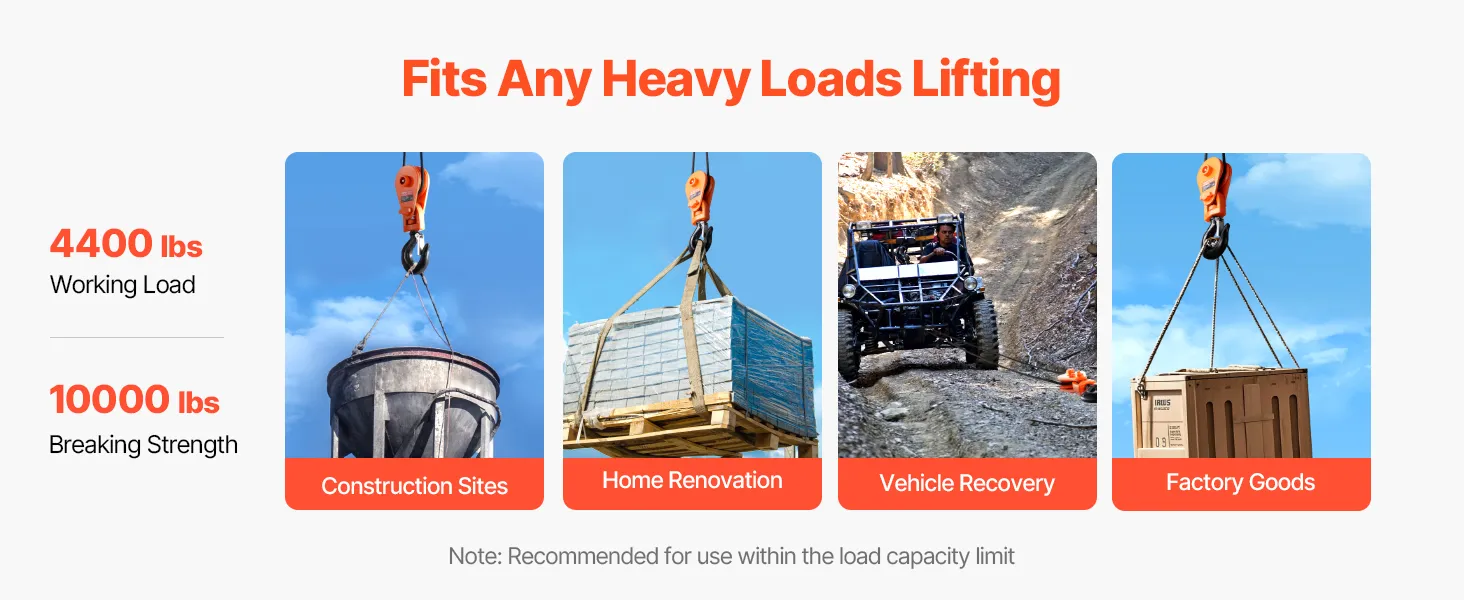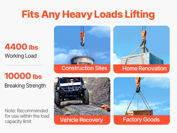 Hefvermogen van 4400 lbs: Deze hijsband is ontworpen voor zware lasten – tot 4400 lbs (2 t) werkvermogen, met een breeklast van 10.000 lbs (4,5 t). Dankzij de rol kunt u zware materialen gemakkelijk verplaatsen, waardoor deze machine ideaal is voor gebruik op bouwplaatsen of bij het bergen van terreinvoertuigen. Bespaar energie en krijg uw werk sneller gedaan.