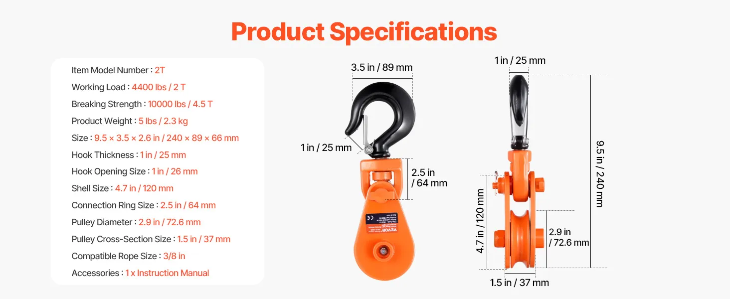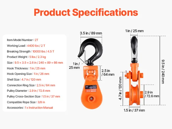 Deze katrol kan zware lasten aan met een nominale werklast van 2 T en een breeksterkte van 4,5 T. Of u nu zware bouwmaterialen verplaatst, aanhangwagens sleept of terreinwagens bergt, met dit blok kunt u zwaar werk eenvoudig en efficiënt uitvoeren.