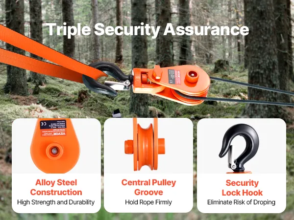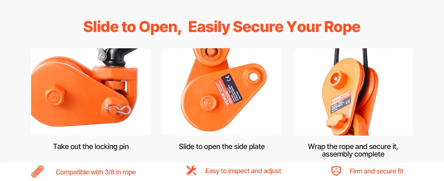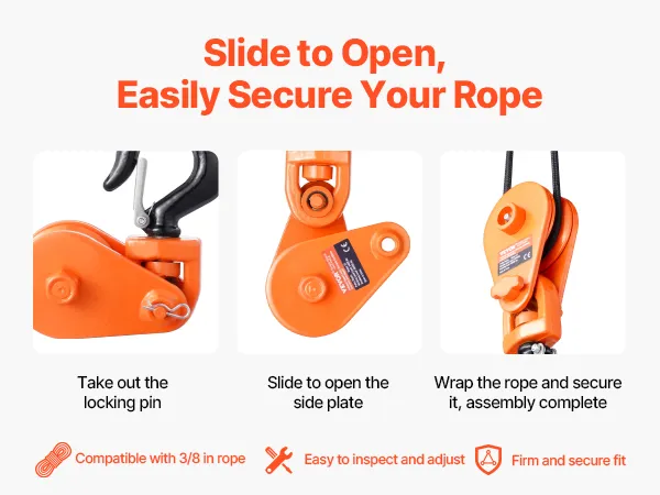 Eenvoudig in gebruik: De zijwand van de katrol is beveiligd met een veiligheidspin, zodat deze eenvoudig kan worden geopend. Schuif hem er gewoon op, steek het touw erin en u kunt beginnen met tillen. U hoeft de kabel niet meer moeizaam door de katrol te halen. Het is snel en eenvoudig, ideaal voor bediening door één persoon.