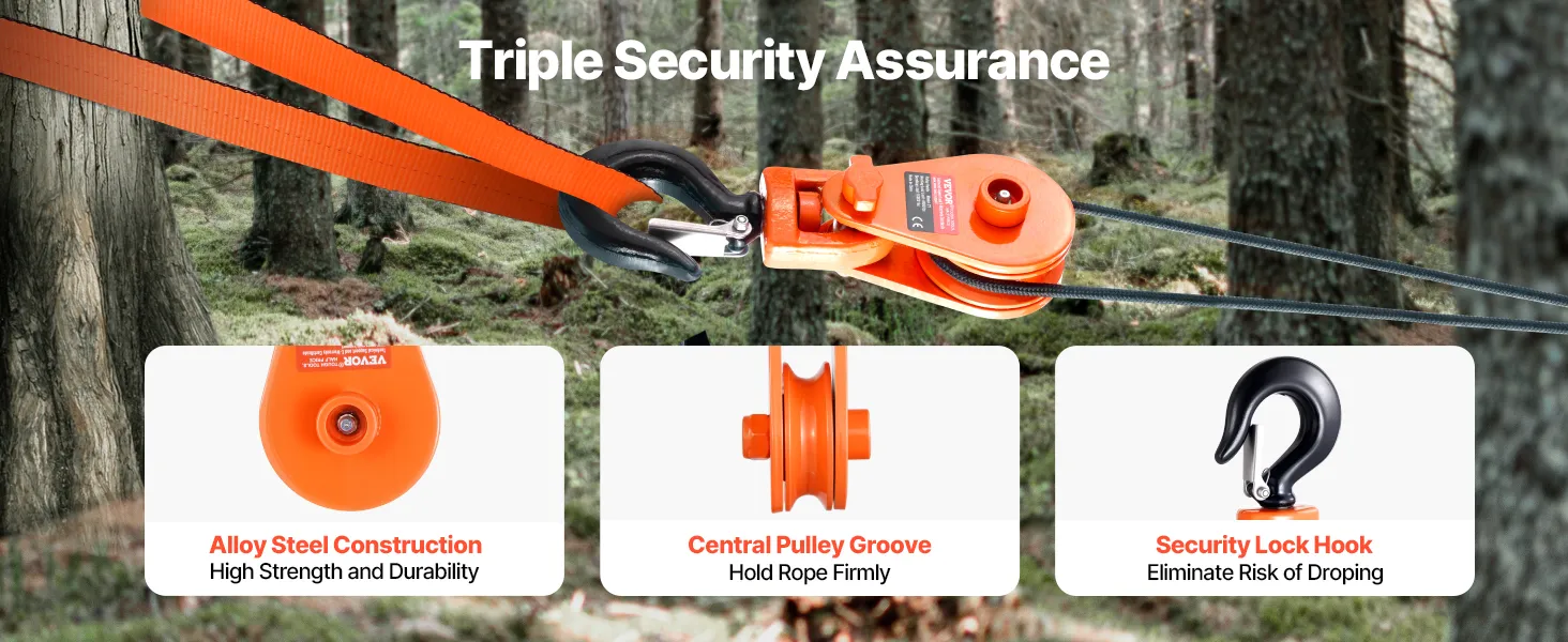 360° draaibare haak: De lierkatrol is uitgerust met een 360° draaibare haak die zich automatisch aanpast aan de hoek van uw lading. Het voorkomt dat het touw gaat draaien en slijten, waardoor het hijsen altijd soepel en stabiel verloopt. Geen gedoe meer met in de knoop rakende touwen of lastig tillen.
