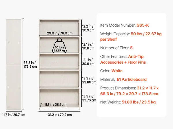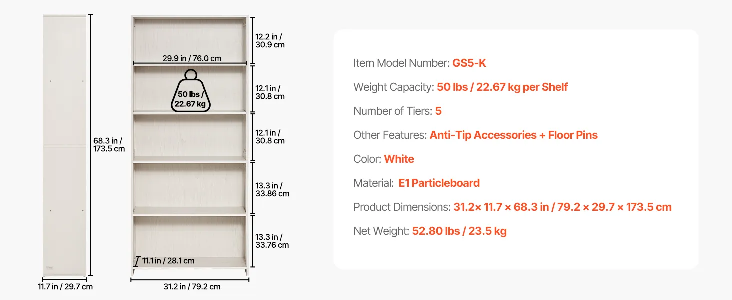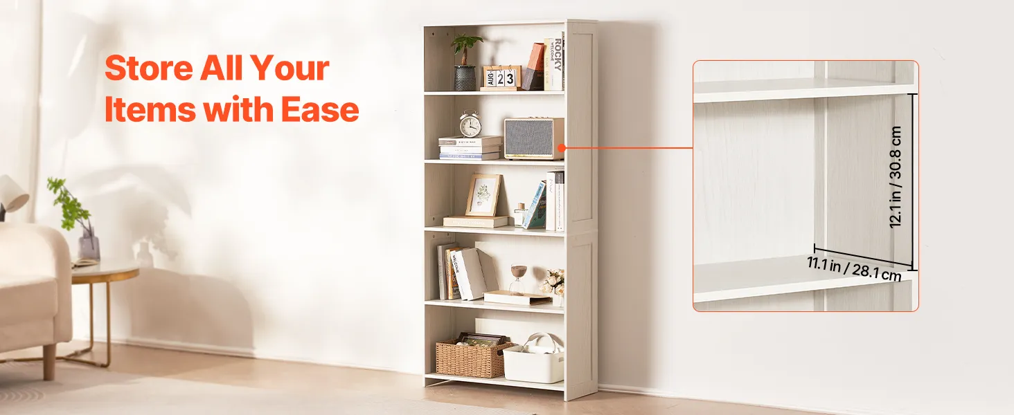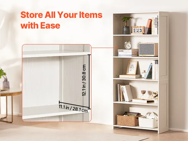 Versatile 5-Tier Bookcase: Maximize your space with this 5-tier bookcase (31.2 x 11.7 x 68.3 in / 79.2 x 29.7 x 173.5 cm). Perfect for any corner in your living room, study, or bedroom, this open bookcase design lets you easily display books, photos, and decorative items.