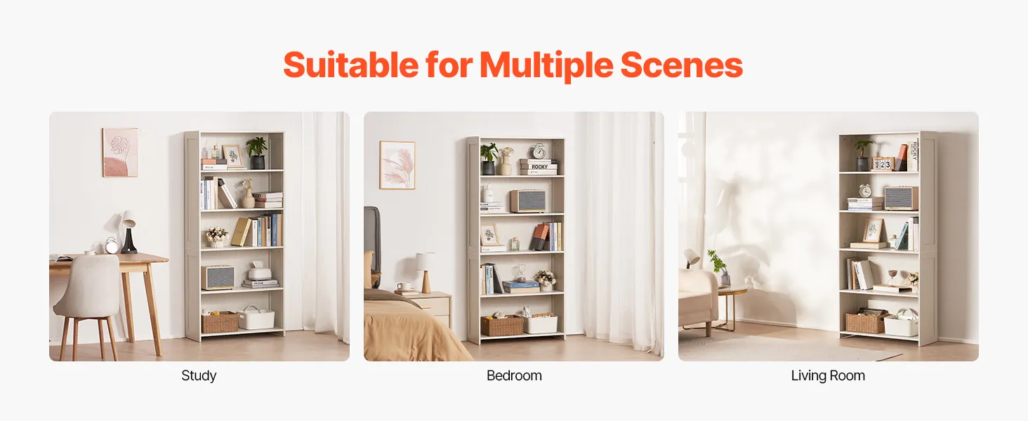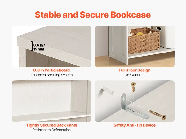 Made with 0.6 in thick particleboard, each shelf can hold up to 50 lbs / 22.67 kg. The tightly fitted back panel and full-floor base structure add extra support, ensuring the tall bookshelf bookcase won’t warp or break, even when fully loaded with books.
