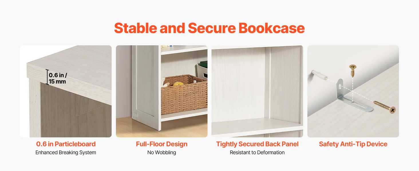 Stable & Secure: The H-shaped structure and thick back panel provide extra stability, keeping everything safely in place. Plus, we've included an anti-tip device to secure it to the wall—just install it to make sure your tall book shelf stays sturdy.