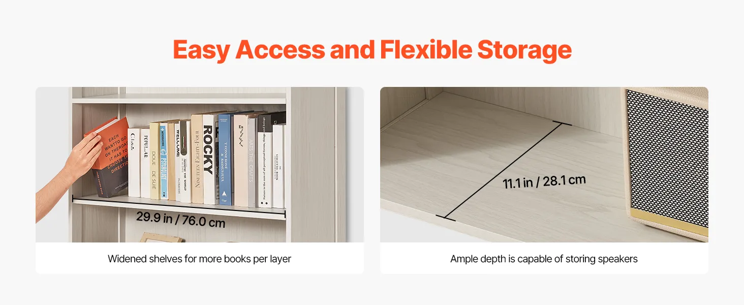 Each shelf is designed with varying heights, allowing you to easily store items of different sizes, such as artwork, vases, and tall books, for a more versatile storage solution.