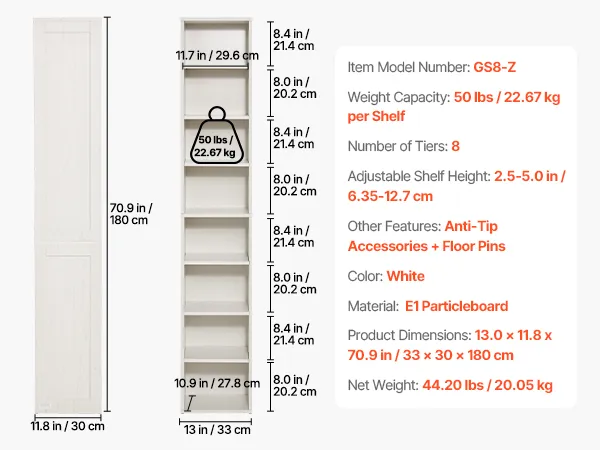 VEVOR 8 Tiers Narrow Bookshelf, 71 in Wooden Tall Open Bookcase with Height-Adjustable Shelf, Freestanding Display Storage Floor Bookcase Bookshelf for Library, Bedroom, Living Room, Office, White