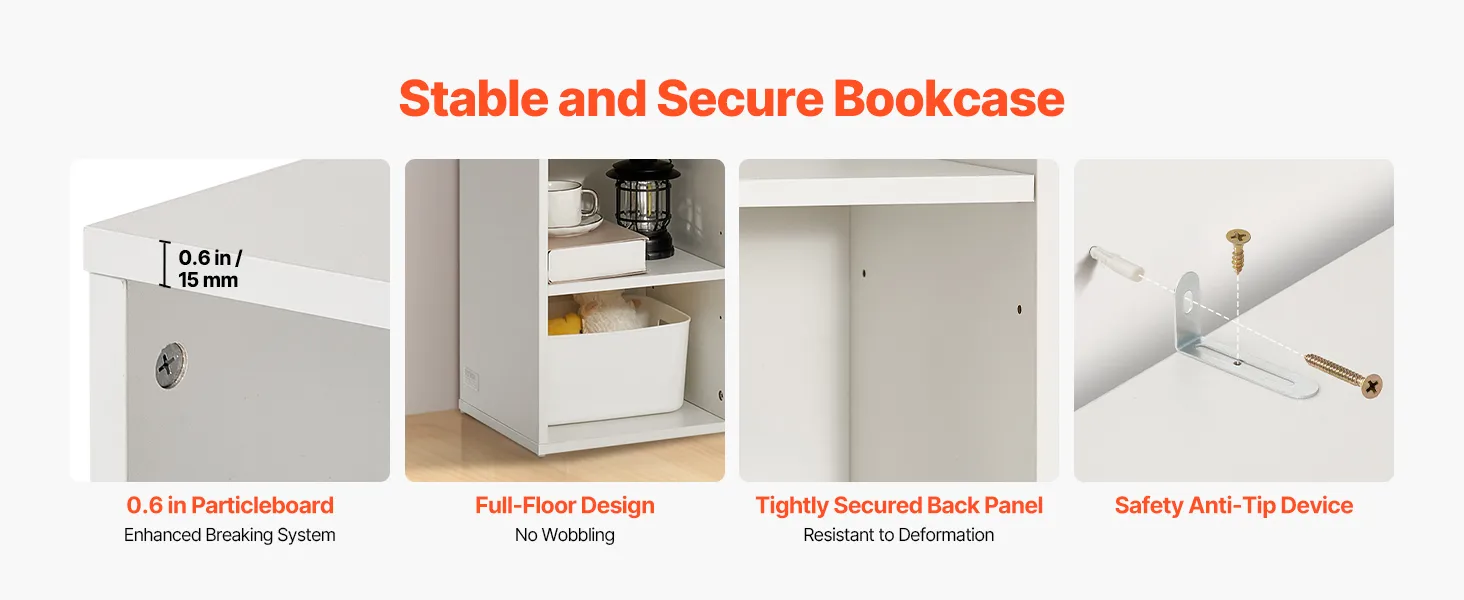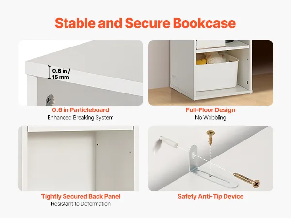 Made with 0.6 in thick particleboard, each shelf can hold up to 50 lbs / 22.67 kg. The tightly fitted back panel and full-floor base structure add extra support, ensuring the tall bookshelf bookcase won’t warp or break, even when fully loaded with books.