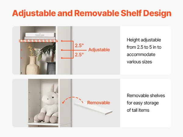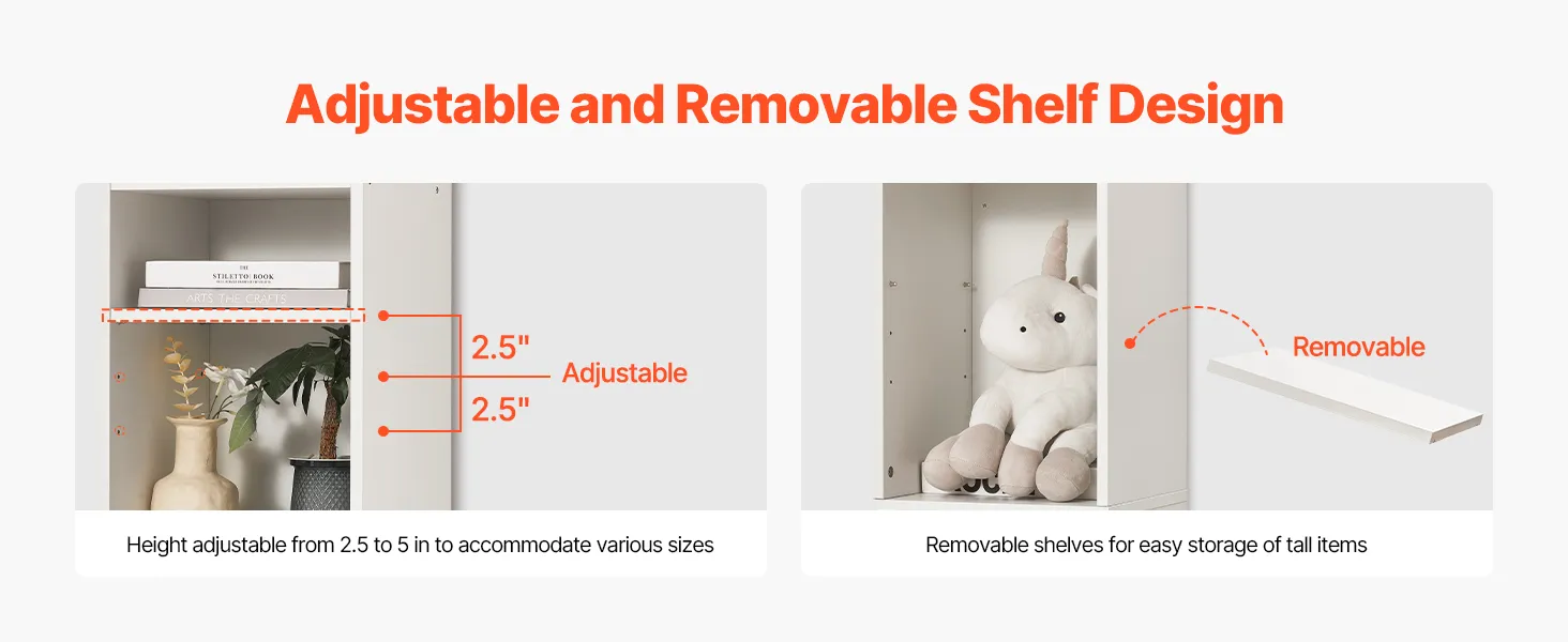 Adjustable Shelves: Customize your storage with adjustable shelves! The first, third, and fourth shelves move up or down by 2.5 in / 6.35 cm, so you can fit taller books, vases, or artwork on your open bookcase and bookshelf.
