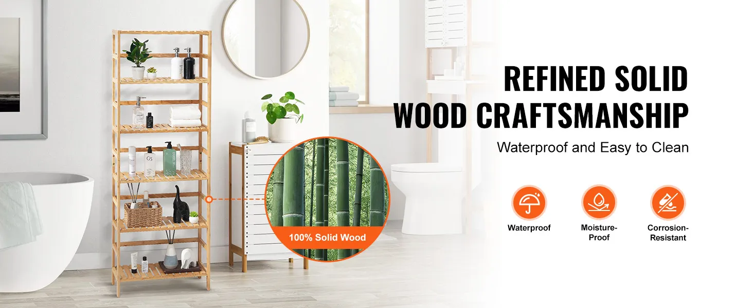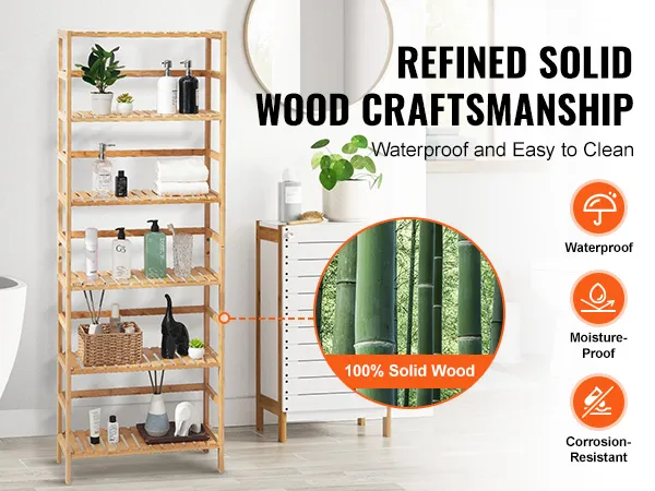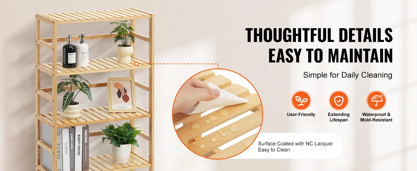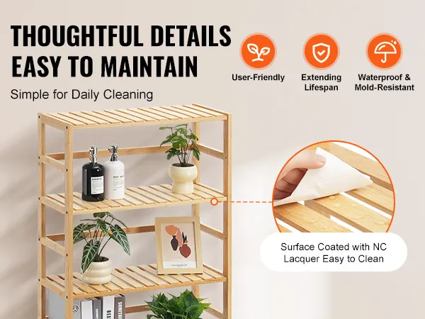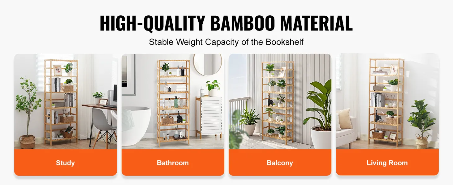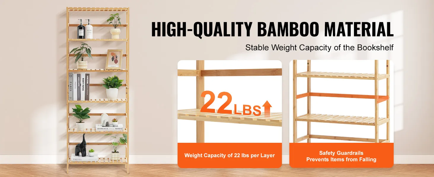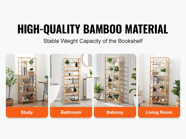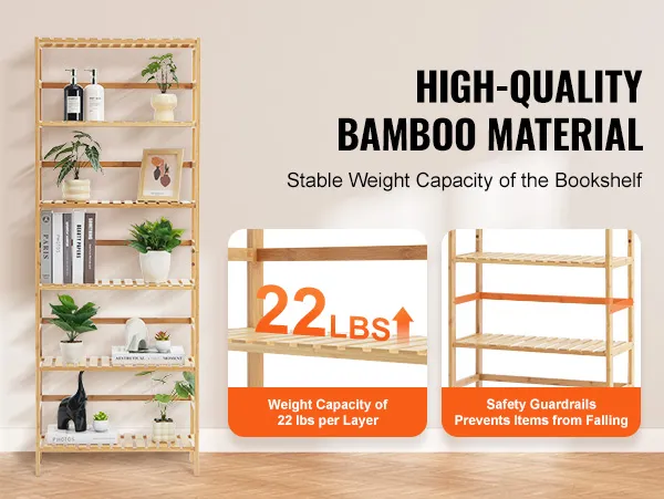 De rondomlopende dwarsbalken zorgen voor extra stabiliteit en voorkomen dat voorwerpen vallen. De bamboe boekenkast is voorzien van een waterdichte NC-verf, waardoor hij geurloos, gemakkelijk schoon te maken en gemakkelijk te onderhouden is.