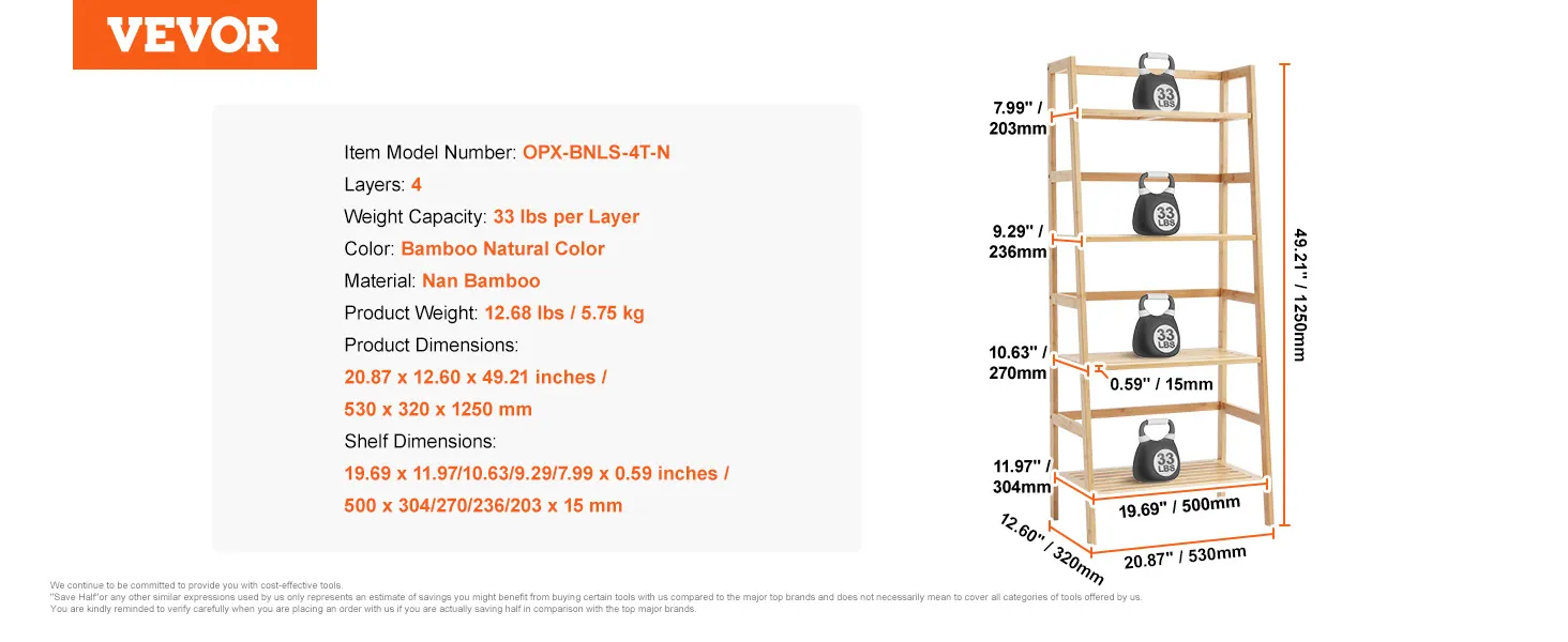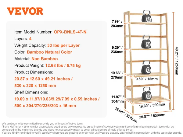 Deze laddervormige boekenkast is gemaakt van 100% puur hout en is zorgvuldig vervaardigd om een stevige en betrouwbare ondersteuning te garanderen. Elke plank kan maximaal 15 kg dragen. Verheug u op een duurzame opslagoplossing.