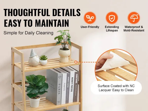 Doordachte details: de rotan boekenplank is uitgerust met beschermende dwarsbalken voor extra stabiliteit en voorkomt dat voorwerpen per ongeluk vallen. Het oppervlak is bedekt met milieuvriendelijke NC-waterdichte verf, niet giftig en geurloos, gemakkelijk schoon te maken, wat het onderhoud vereenvoudigt, de bamboe beschermt en de levensduur verlengt.