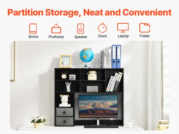 Easy to Assemble: Upon receiving the desk bookshelf, you'll find detailed installation instructions included, enabling you to assemble quickly and enjoy a neat and organized space. Note: Due to differences in lighting conditions and viewing devices, there may be color discrepancies between the actual product and the photos.