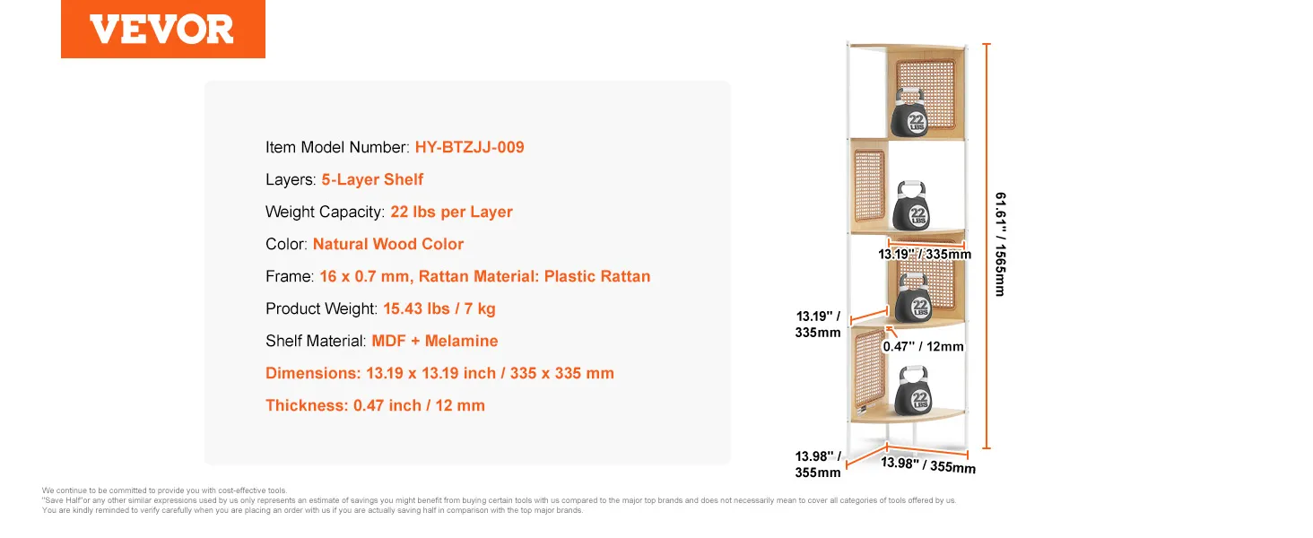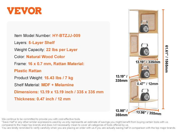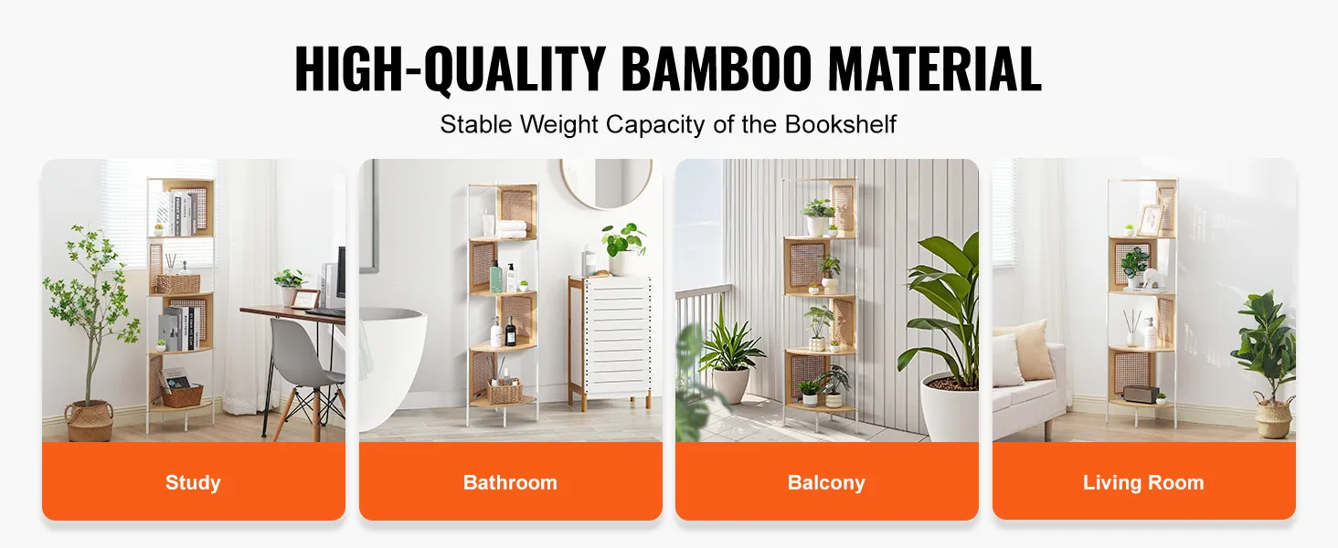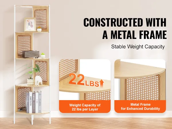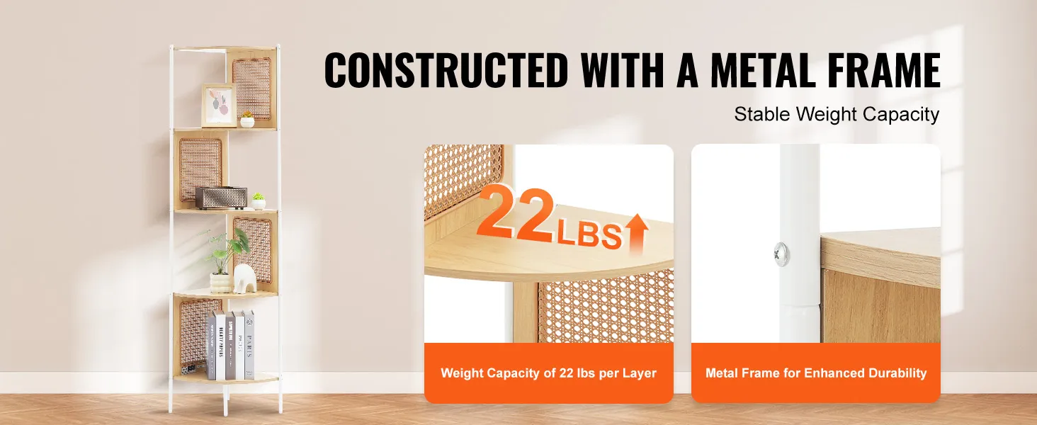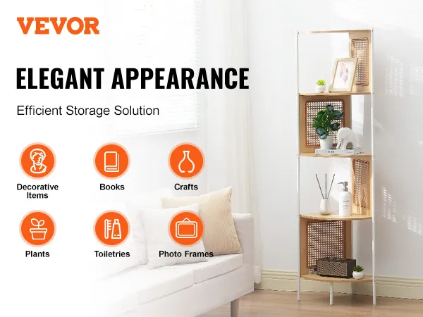The 5 tier open shelf design maximizes space efficiency, with each shelf perfectly sized to store your essentials. This corner bookshelf helps keep your space more organized and aesthetically pleasing.