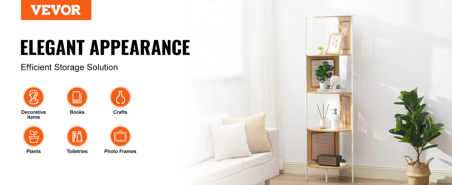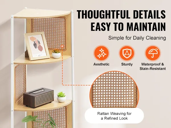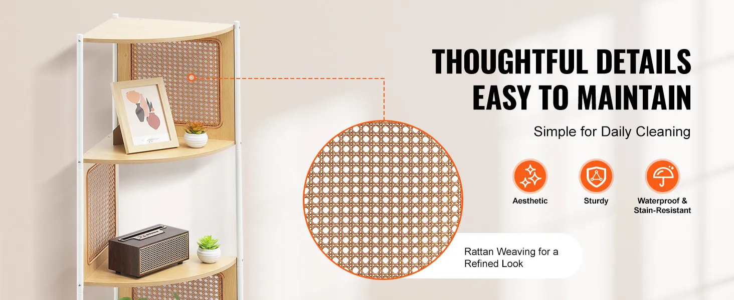 Crafted from premium PE rattan, it’s free from sharp edges, making it safe to handle, while allowing air circulation for a breathable storage space. This corner shelf stand adds an elegant touch to your home.