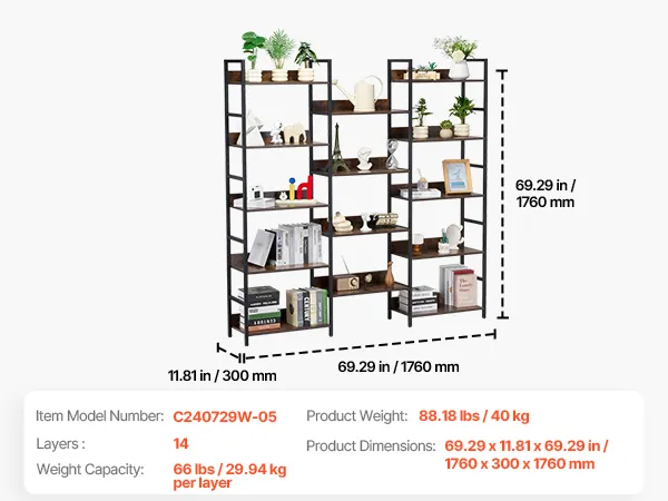 VEVOR Triple Metal Bookshelf, 14-Tier Industrial Bookshelf, Large Rustic Vintage Storage Bookcase with Open Shelves, Freestanding Display Shelving Unit Storage Rack, for Living room, Bedroom & Office