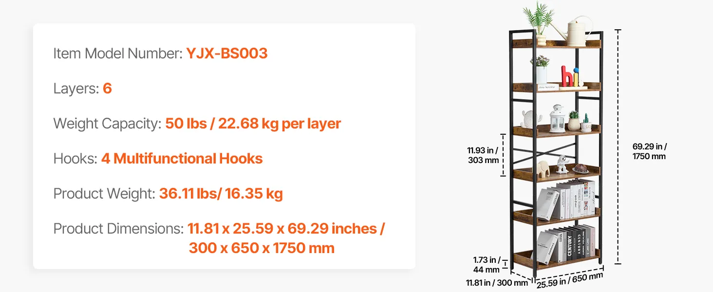 VEVOR Metal Bookshelf, 6-Tier Industrial Bookshelf, Tall Wide Rustic Vintage Storage Bookcase with Open Shelves, Freestanding Display Shelving Unit Storage Rack, for Living room, Bedroom & Office