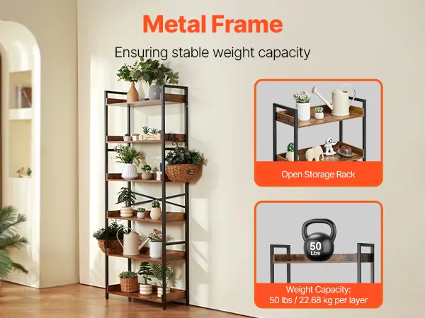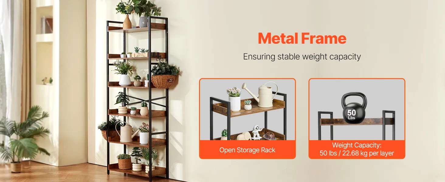 Sturdy and Durable: Built with a full metal support frame, this open bookshelf is not only robust and long-lasting but also supports up to 50 lbs per shelf, ensuring your valuables are securely stored, standing the test of time.