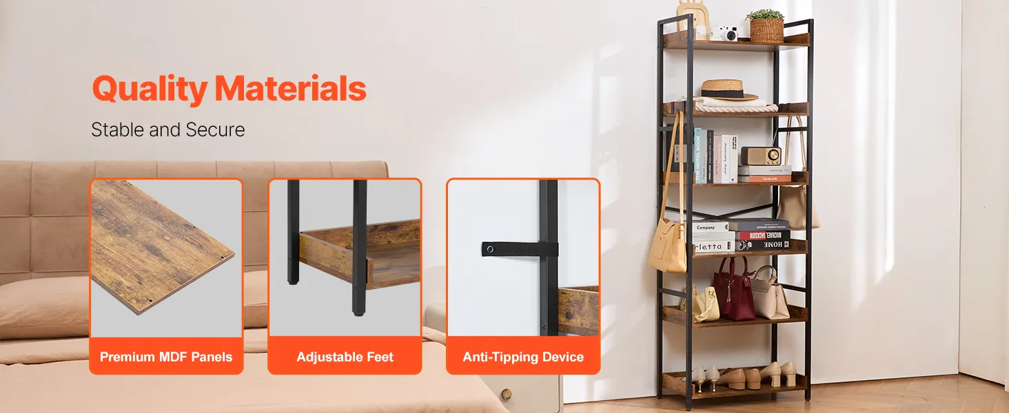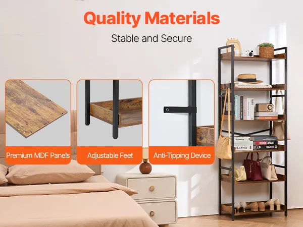 Thoughtful Details: This standing bookshelf features high-quality MDF panels with a smooth, waterproof, and scratch-resistant surface, making cleaning and maintenance easy. Adjustable foot pads further enhance its stability for stress-free storage.