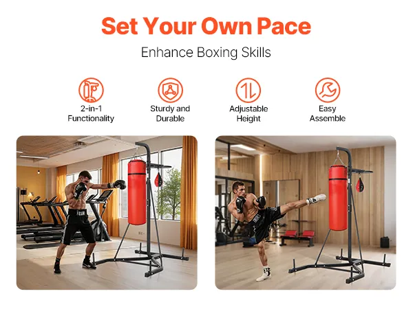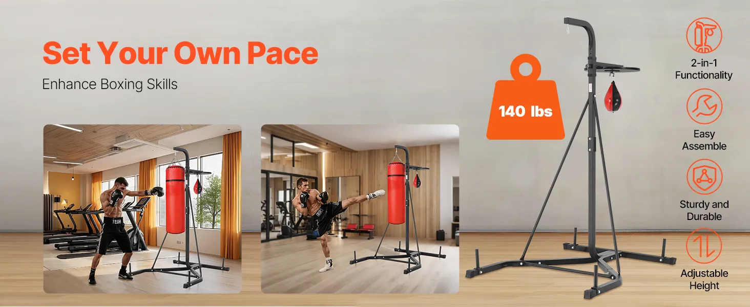 VEVOR 2 in 1 Punching Bag Stand, Steel Heavy Duty Workout Equipment, Adjustable Height Boxing Punching Bag and Speed Bag Stand, Freestanding Sandbag Rack, Holds Up to 140 lbs, for Home Gym Fitness