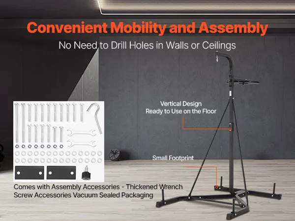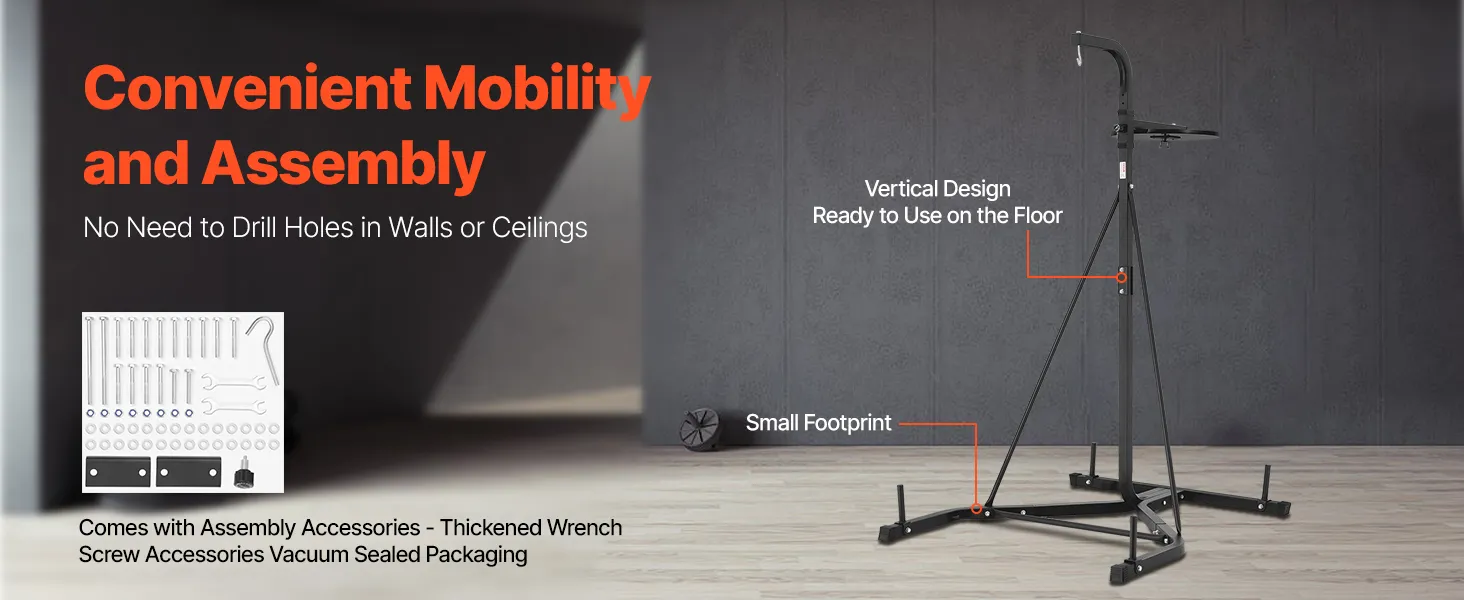 The sandbag rack doesn't require fixing to the floor, just secure the main frame and install the punching bag. With our instructions, the stand can be assembled in minutes. Installation tools are included in the package, and even solo installation by females can be swiftly accomplished.