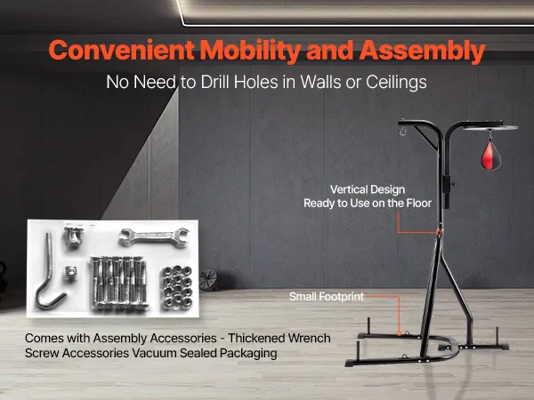 The sandbag rack doesn't require fixing to the floor, just secure the main frame and install the punching bag. With our instructions, the stand can be assembled in minutes. Installation tools are included in the package, and even solo installation by females can be swiftly accomplished.