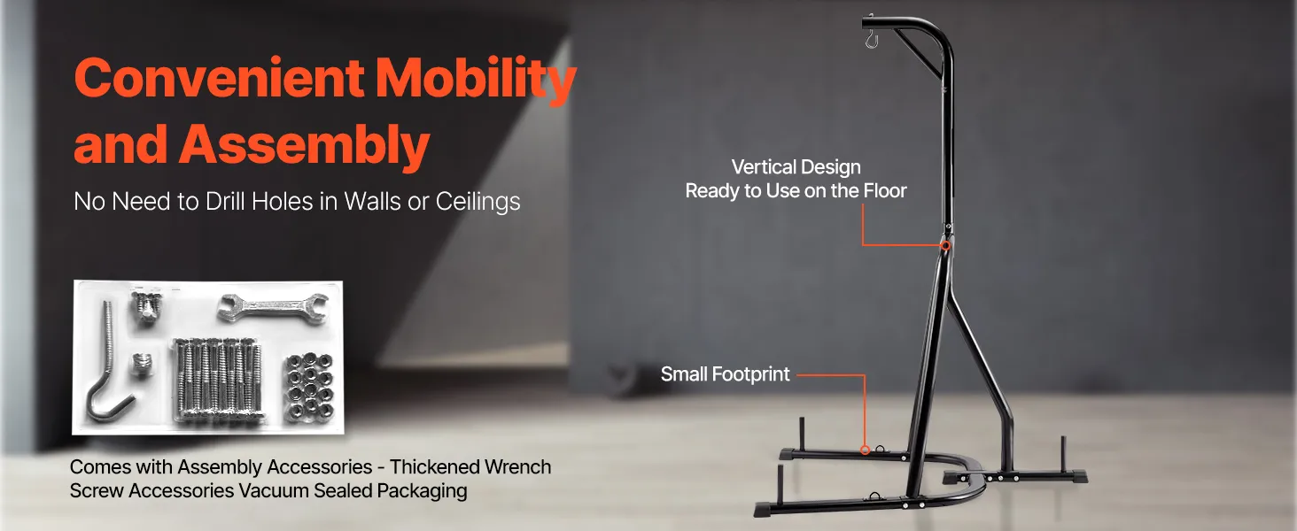 The sandbag rack doesn't require fixing to the floor, just secure the main frame and install the punching bag. With our instructions, the stand can be assembled in minutes. Installation tools are included in the package, and even solo installation by females can be swiftly accomplished.