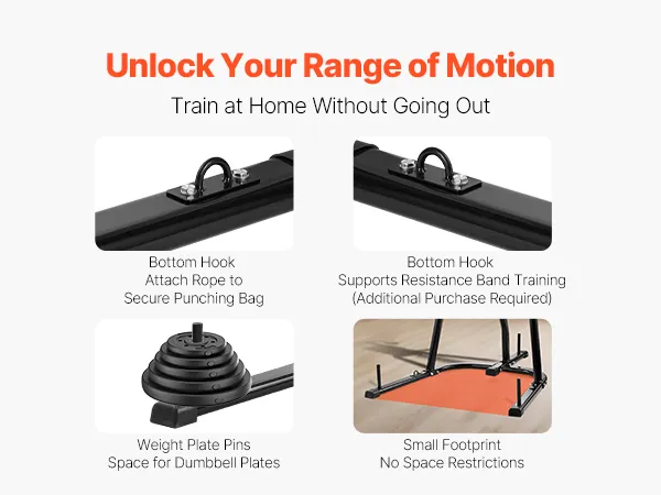 User-Friendly Design: Our sandbag rack is designed with a 90-degree angle at the bottom, allowing placement in corners to save space. The hook design enables hanging of resistance bands for training or for connecting ropes to secure the punching bag. You can also place dumbbell plates on the weight plate pins to further enhance stand stability.