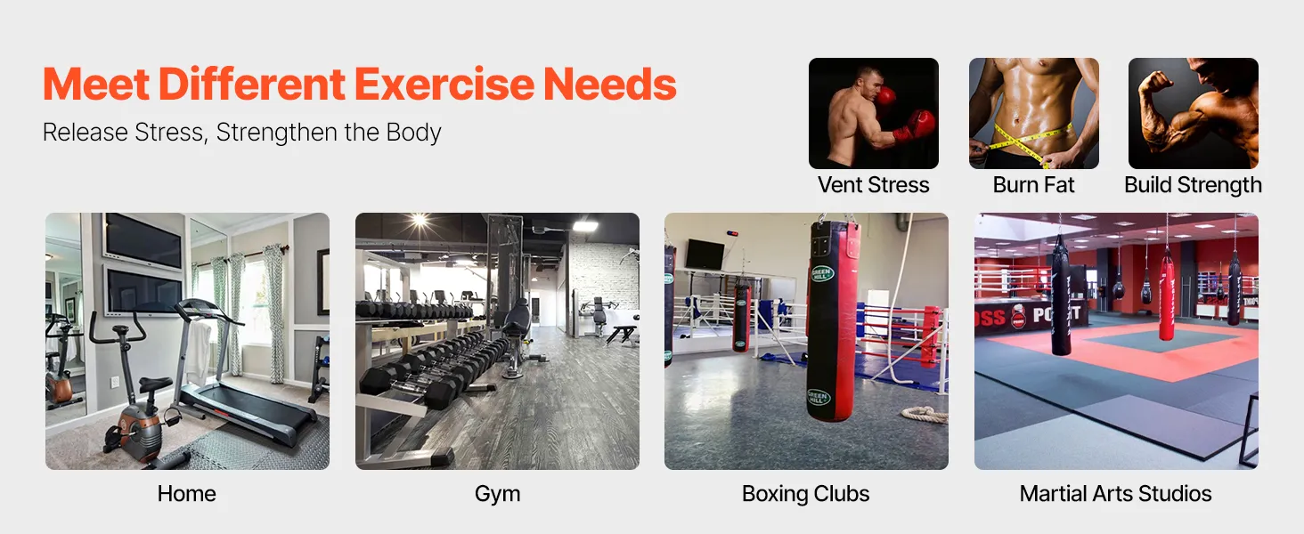Small Footprint: No specific location requirements, free installation, no need for drilling holes in walls or ceilings. This boxing training equipment can be placed without clearing floor space, suitable for both small and large living spaces, usable at home, gyms, boxing clubs, martial arts studios, etc.