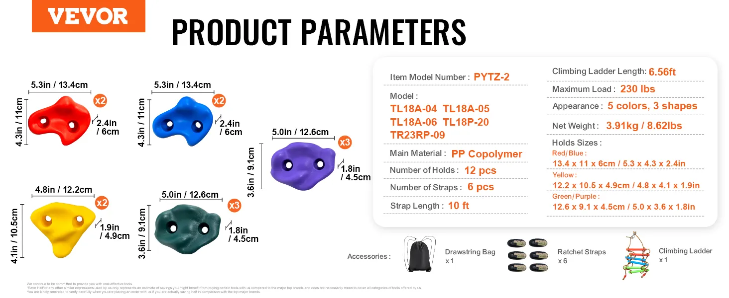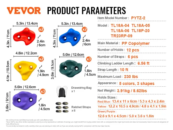 Safe, Durable, and Stable: Made from high-quality PP copolymer, our climbing rocks are durable and wear-resistant. With the included ratchet straps, these holds are incredibly sturdy, supporting weights up to 230 lbs for both kids and adults. These weather-resistant rocks provide reliable strength, preventing slips and making climbers feel as secure as being on their dad's shoulders.
