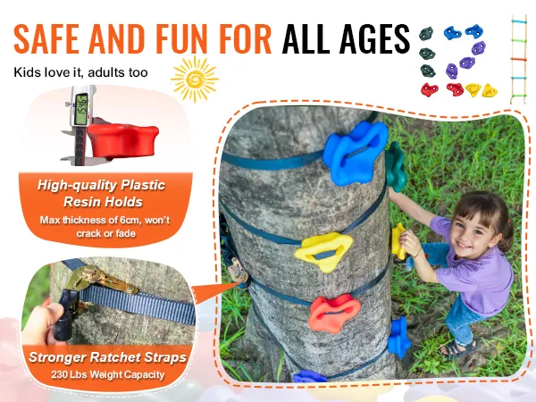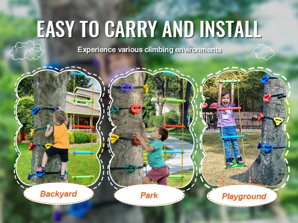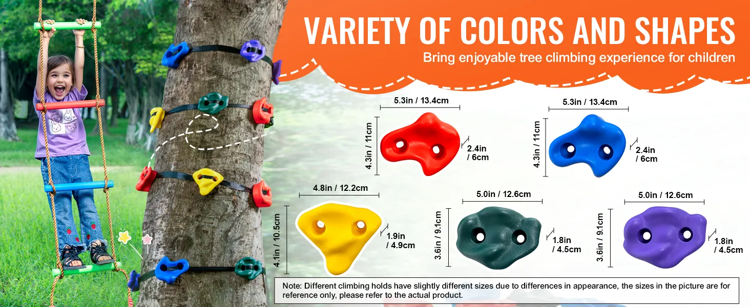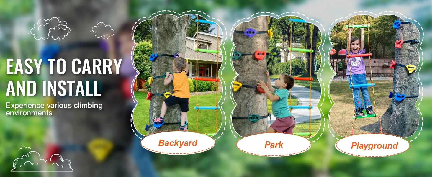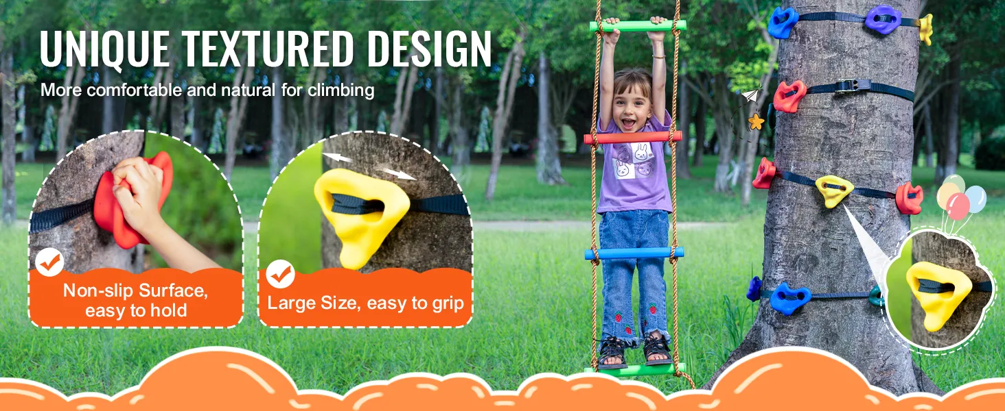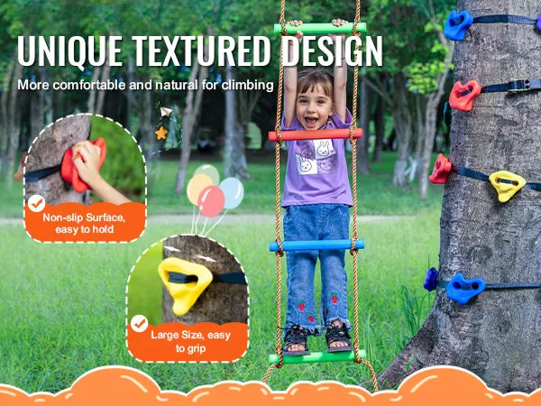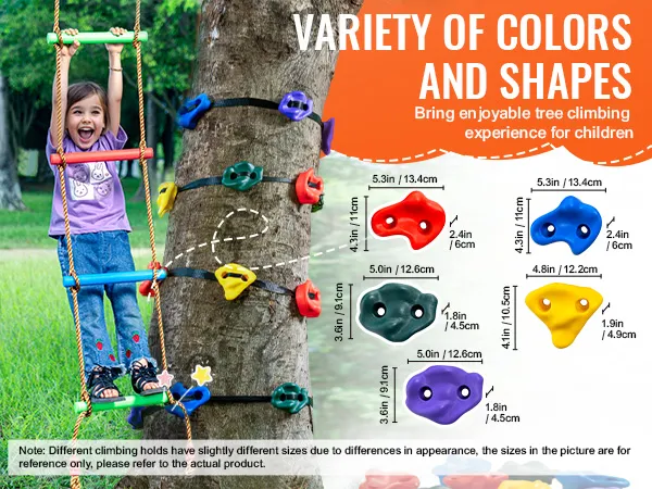 Large, Easy-to-Grip Holds: The rock climbing holds for trees come in various sizes. Their unique anti-slip textured surface makes them easy to grip and step on, providing a safe and comfortable hold for children while climbing. This activity helps improve children's hand-eye-foot coordination, develops their sense of balance, enhances concentration, and builds confidence and courage.