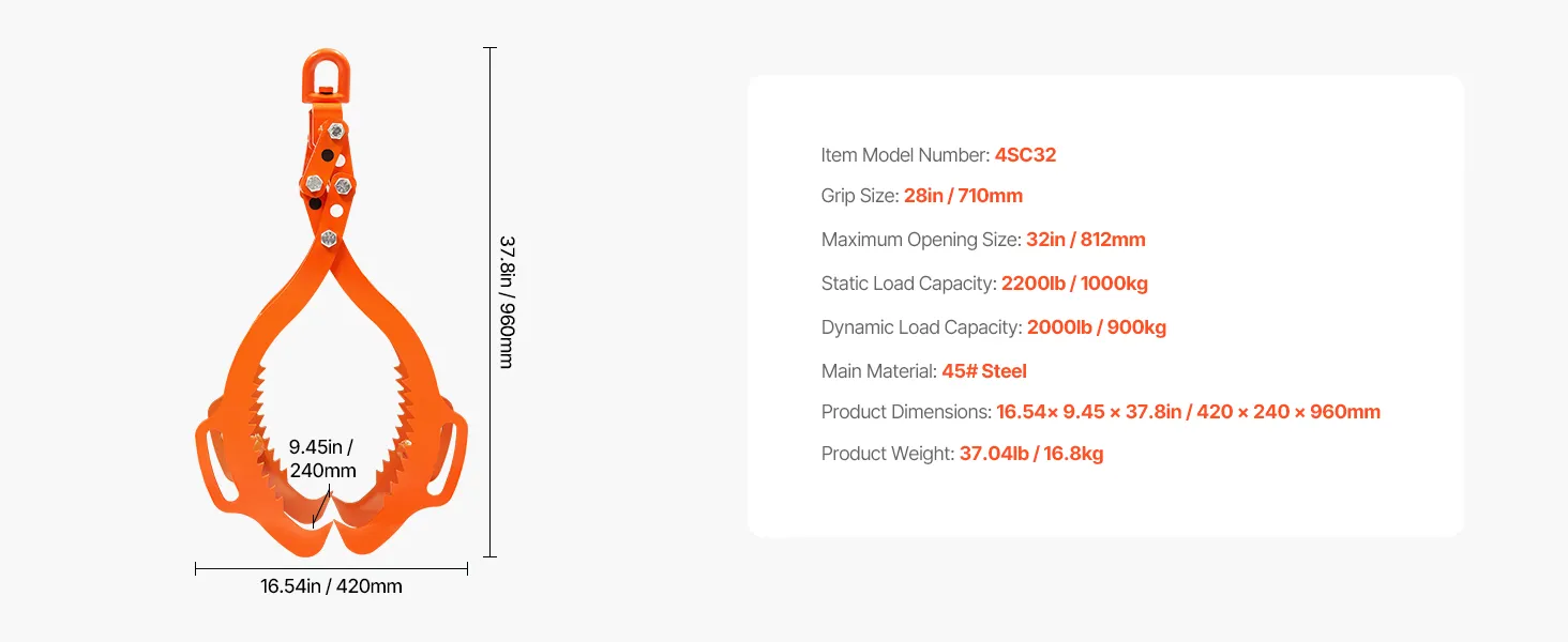 High Load Capacity: With a maximum load capacity of 2200 lbs, these log lifting tongs make heavy-duty tasks like transporting logs, wire mesh, and hay bales easier and safer. Equipped with a 360° rotating hook, they allow for quick adjustments and smooth handling. The ergonomic design minimizes fatigue, improving overall comfort and usability.
