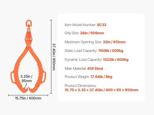 Flexible Grip: The 32-inch log tongs feature an adjustable opening from 28 to 32 inches, providing a secure grip for various object sizes. This flexibility enhances efficiency and ensures stability during operation.