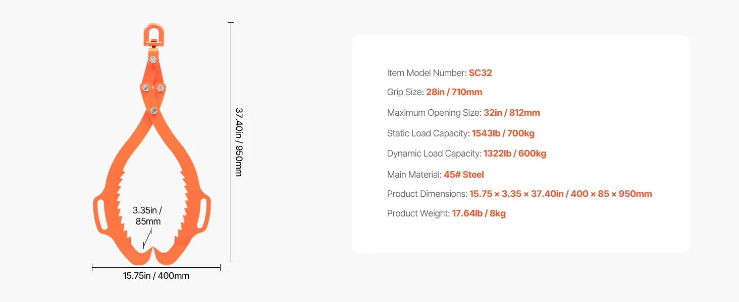 High Load Capacity: With a maximum load capacity of 1543 lbs, these log lifting tongs make heavy-duty tasks like transporting logs, wire mesh, and hay bales easier and safer. Equipped with a 360° rotating hook, they allow for quick adjustments and smooth handling. The ergonomic design minimizes fatigue, improving overall comfort and usability.
