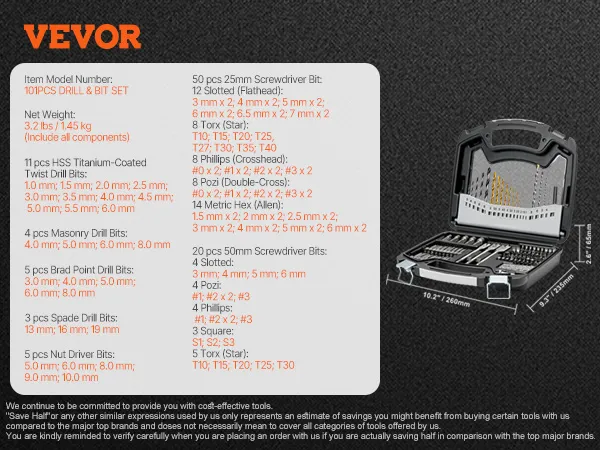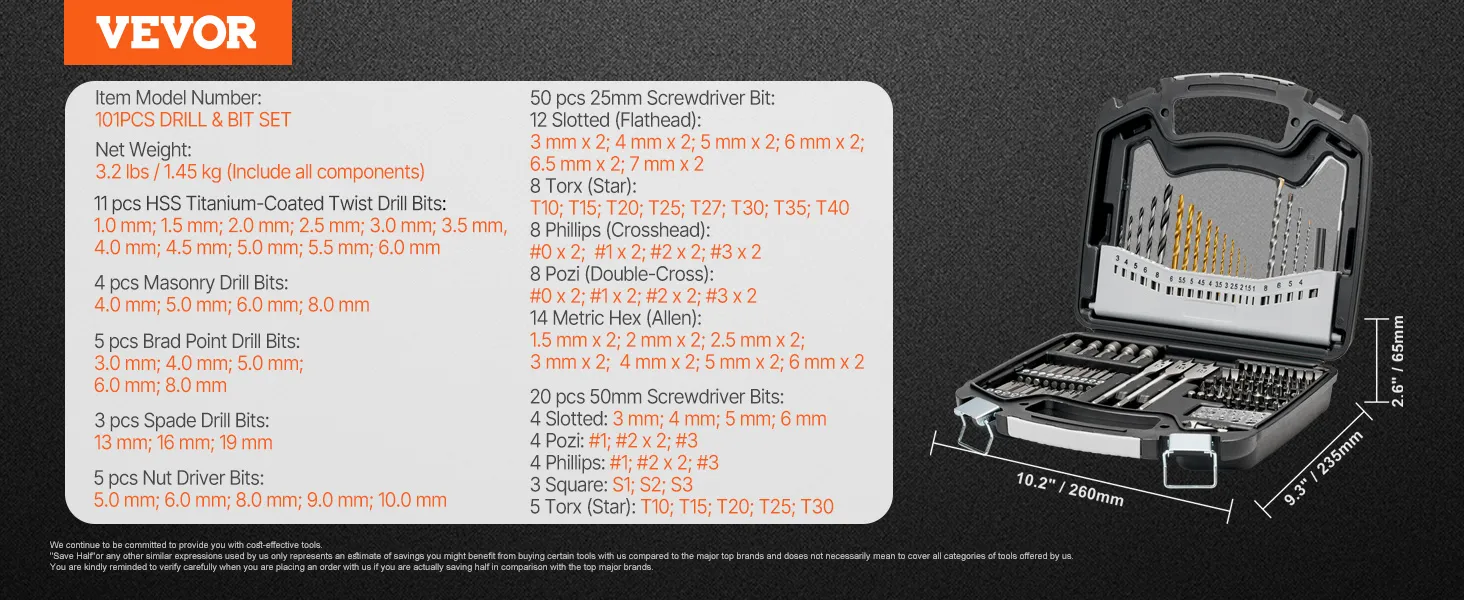 VEVOR Drill Bit Set, 101 Pieces Drill and Driver Bit Set, Screwdriver Bit Set Suitable for Wood Metal Cement Drilling and Screw Driving, Drill Bit Sets Combo Kit Assorted in Organized Carrying Case