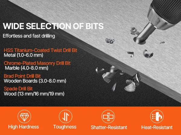High-Quality Drill Bits: Made from premium HSS or carbon steel with precision coating, our drill bit set offers excellent strength and sharpness. It easily penetrates metal, plastic, masonry, and wood, providing long-lasting performance without wear or breakage.
