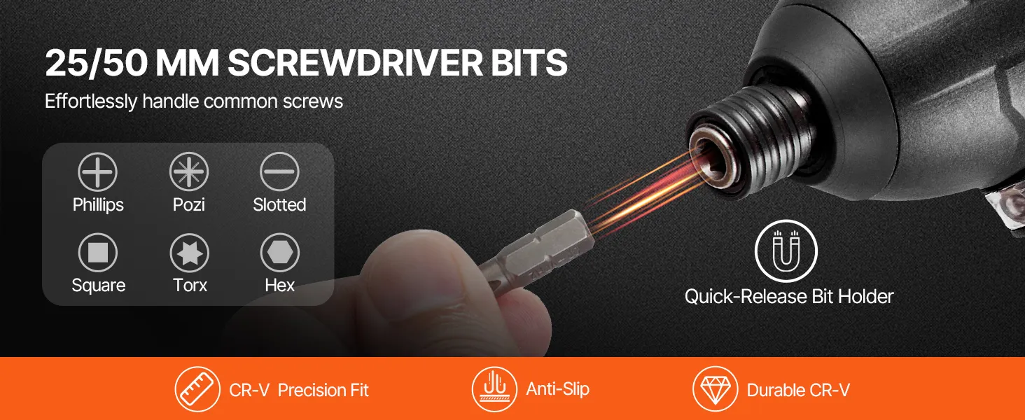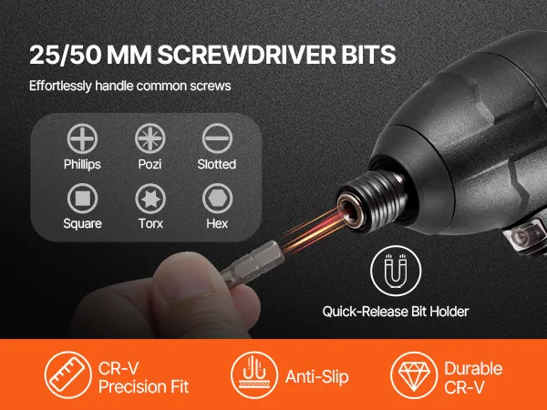 This screwdriver bit set handles common screws and nuts effortlessly. Its strong CR-V bits provide lasting durability and avoid slipping, ensuring smooth and reliable performance.