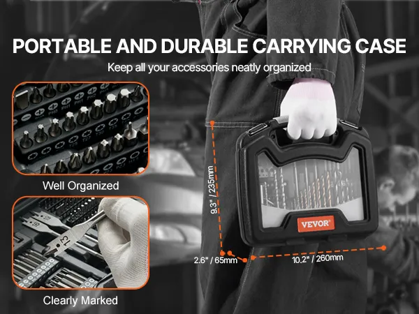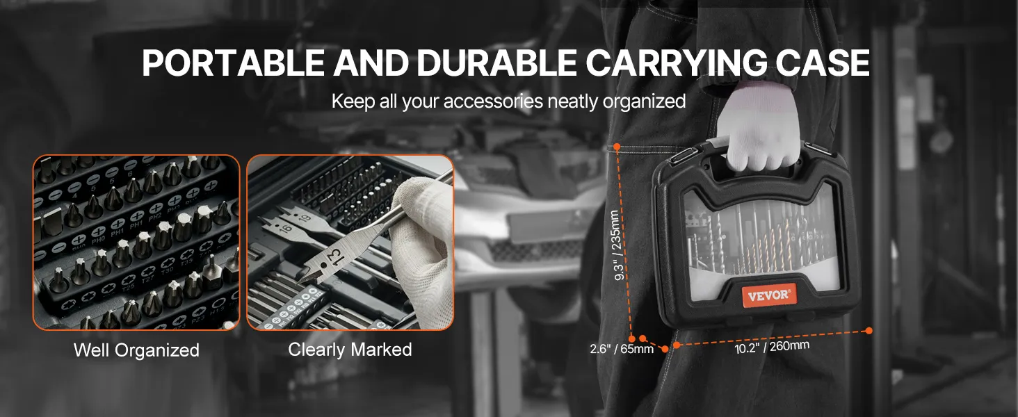This drill driver set is easy to carry for outdoor use. The case features clear labels and slot designs to keep accessories securely in place and organized, allowing for quick and easy access.
