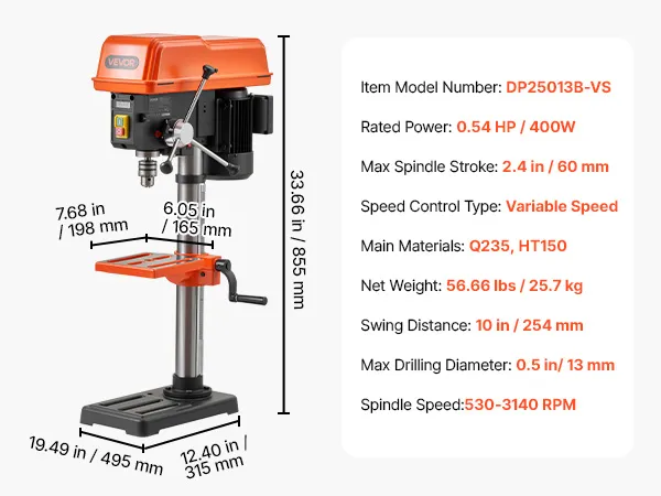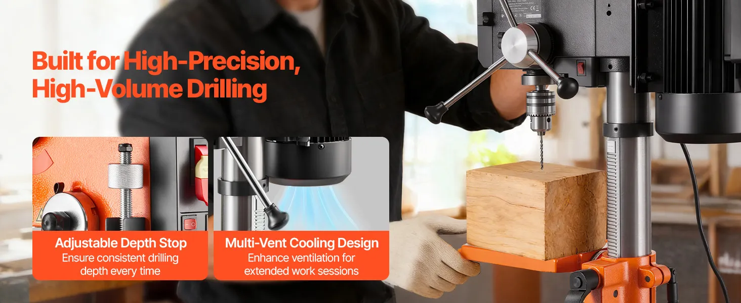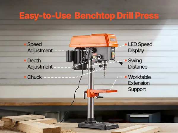Snelheidsregeling: Deze tafelboormachine biedt een variabele snelheid van 440 tot 2600 tpm met een digitaal display, waardoor snelle aanpassingen mogelijk zijn voor verschillende materialen en projecten.