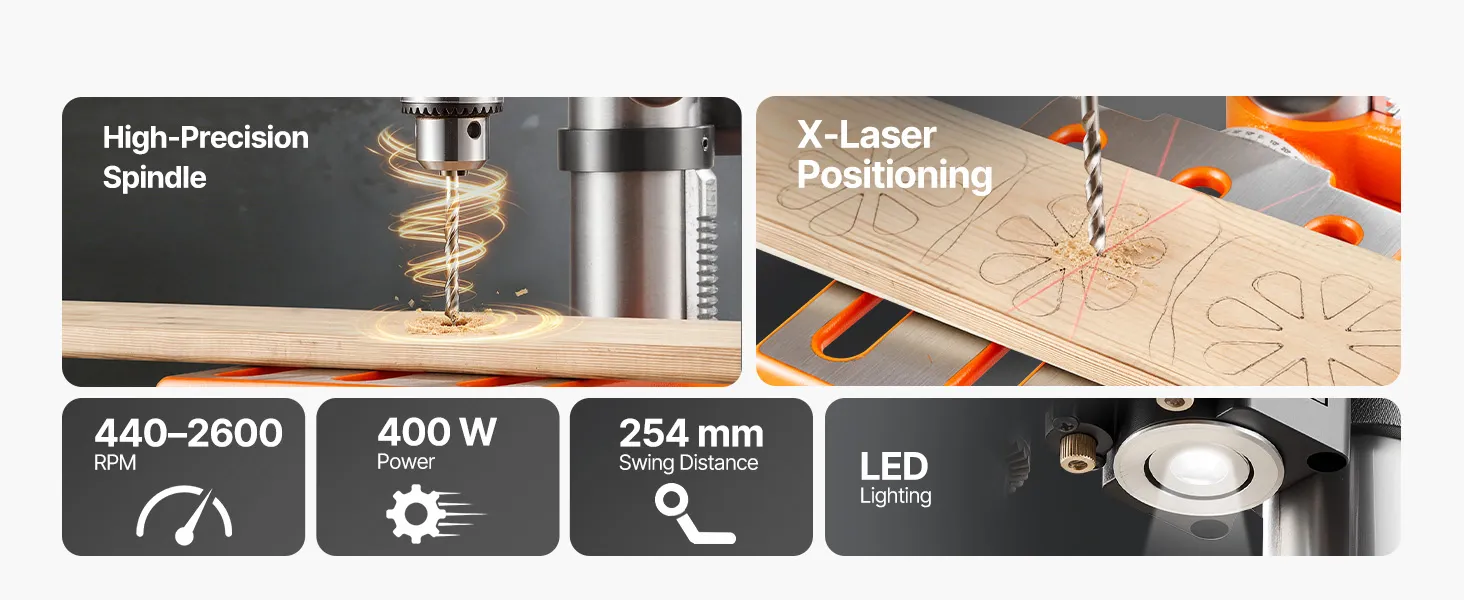 Krachtige boorprestaties: Onze tafelboormachine met een 400W motor en een doorvoerdiepte van 254 mm levert betrouwbare prestaties. Ideaal voor houtbewerking, metaalbewerking en doe-het-zelfprojecten.