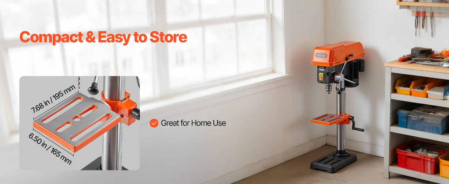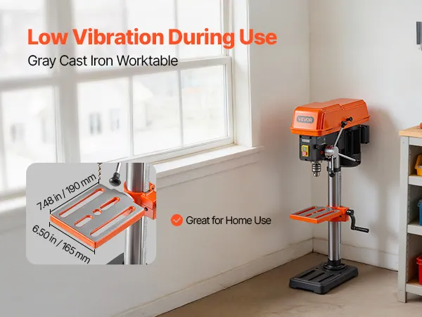 Stabiele en verstelbare werktafel: Dankzij de versterkte metalen werktafel biedt deze tafelboormachine uitstekende stabiliteit. De hoogte is verstelbaar en de werktafel kan 45° naar links of rechts worden gekanteld voor nauwkeurige positionering bij complexe boorhoeken.