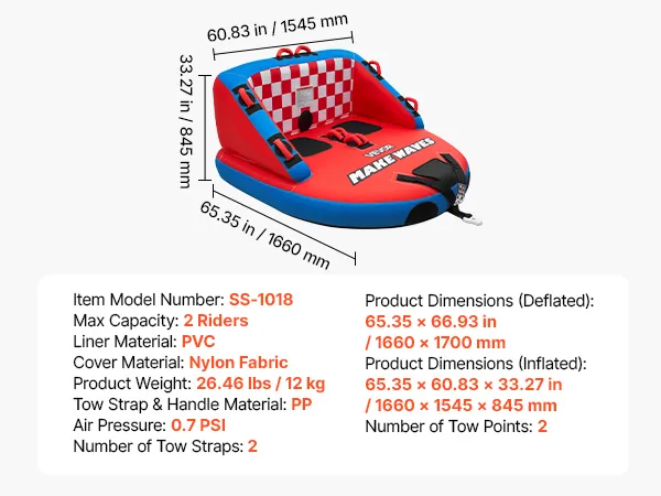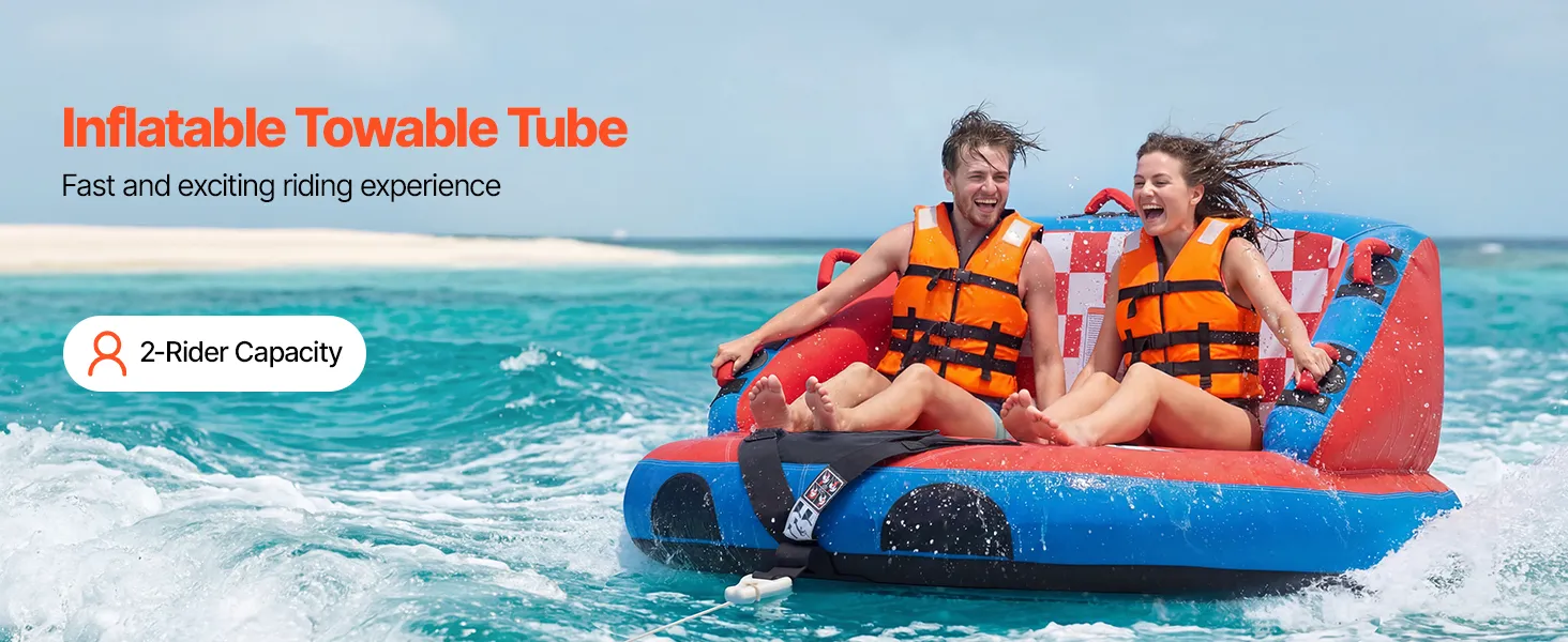 Beleef opwindend waterplezier met onze sleepband voor 2 personen. De dikke PVC-binnenvoering en de robuuste nylon hoes zorgen voor een lange levensduur. Snel opblazen en leeglaten, samen met de gewatteerde handgrepen, bieden comfort en extra veiligheid tijdens uw wateractiviteiten.