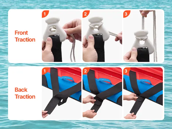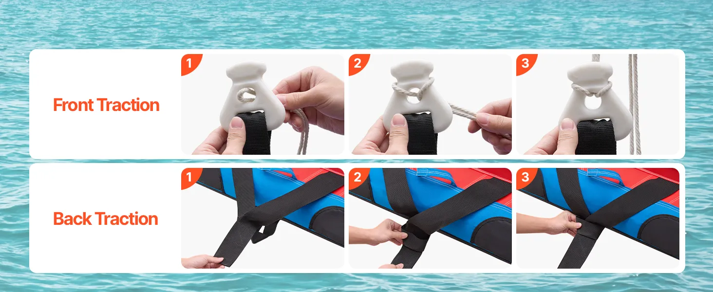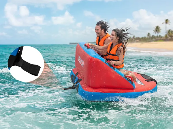 Verbeterd comfort en stabiliteit: De sleepband voor 2 personen is voorzien van tien gewatteerde handgrepen voor een veilige grip, evenals twee instapbanden die het snel terug in het water vergemakkelijken na een val.